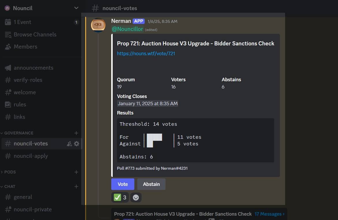 The Nerman governance bot has been operating for over 2 years. This bot provides Discord communities a formal, automated governance process while also facilitating their participation in DAOs like Nouns and Lil Nouns.