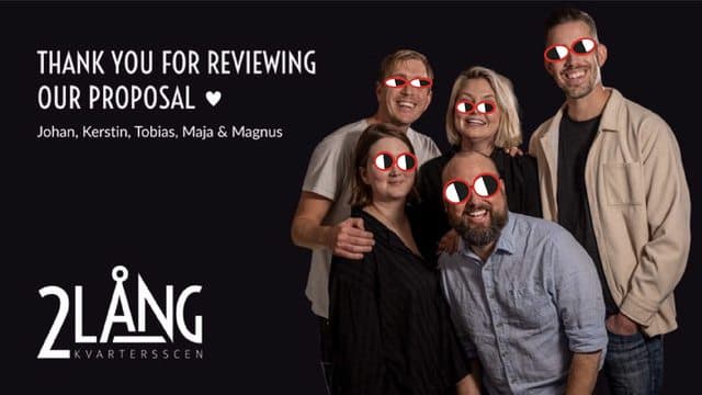 We are 2Lång, a beloved theatre in Gothenburg Sweden, with over 15,000 visitors annually. We make satirical, comedic productions and have built a strong, engaged community on-stage and online, with an additional 10,000 followers on social media.