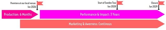 | Performance & Impact | <small> Live performance for 7000 people (based on data from current show). 2 years performing at own venue and 1 year on tour. Leveraging relationsships with teater around Sweden that we built with current tour. |