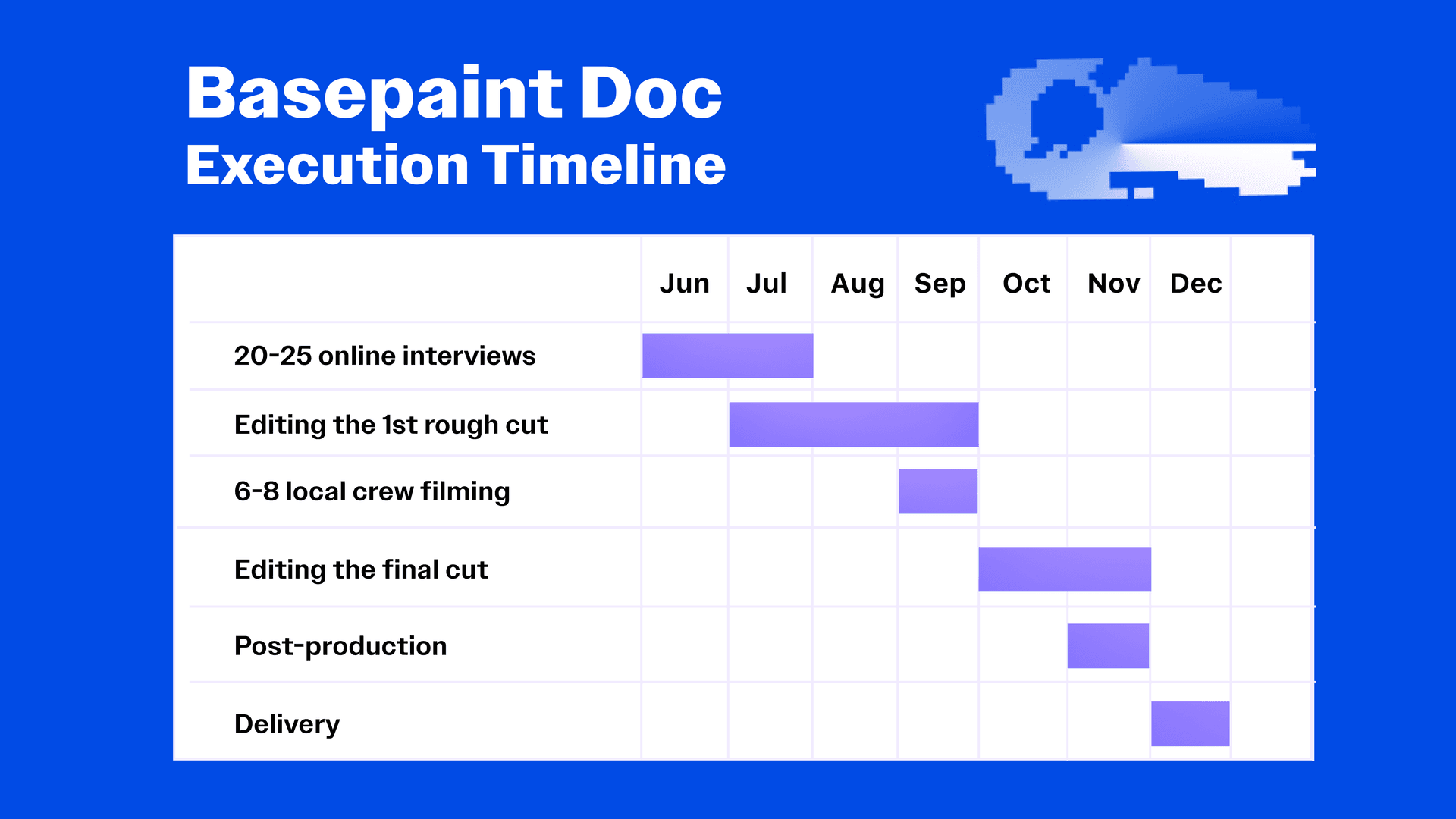 Our production will involve over 20 in-depth online interviews with Basepaint artists. We will uncover the most impactful and surprising stories – those where Basepaint has genuinely transformed an artist's life. Following these interviews, local film crews will capture B-roll and drone footage to visually enrich the narrative.