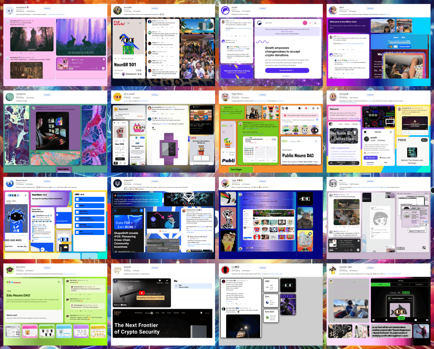 These custom space systems will have their own domain, branding, homepage, directories, and default configs for profiles and dashboards that the members can further customize. Not only will noun.space be the first ever "channel client," it will become the base template upon which all channels and communities can deploy their platforms.