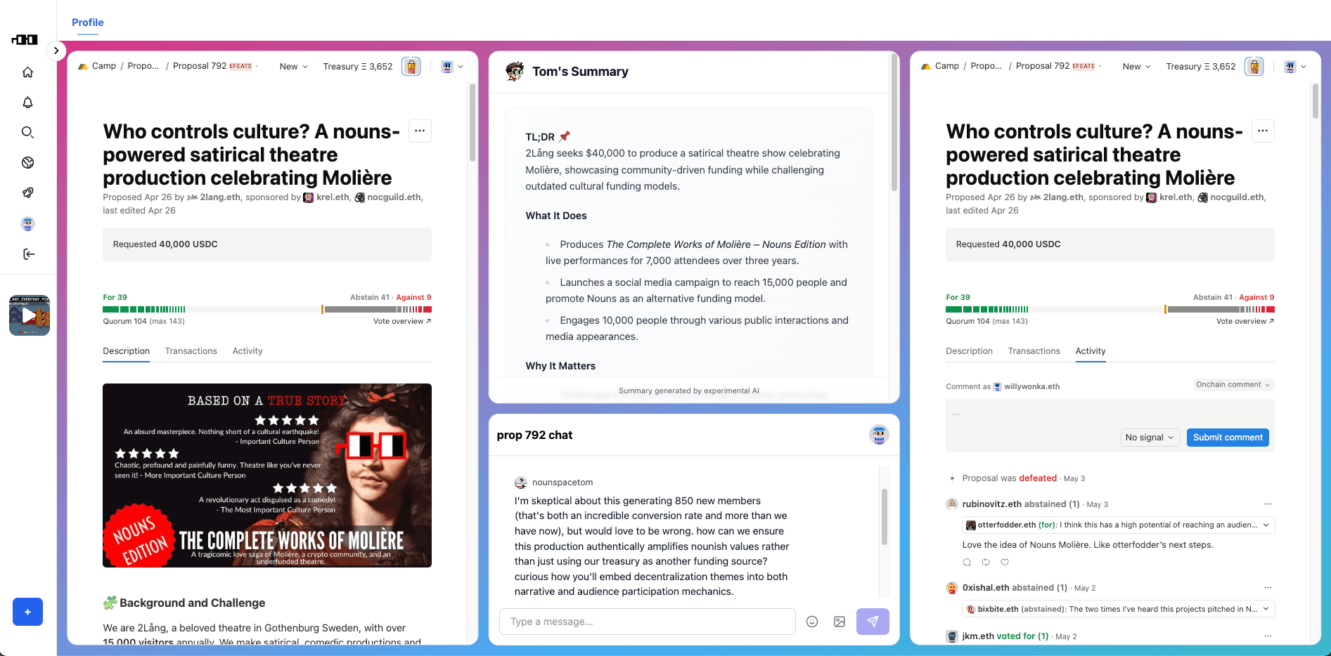 We went ahead and built v0 of Proposal Spaces during the hackathon at FarCon, including Mini App support (check it out).