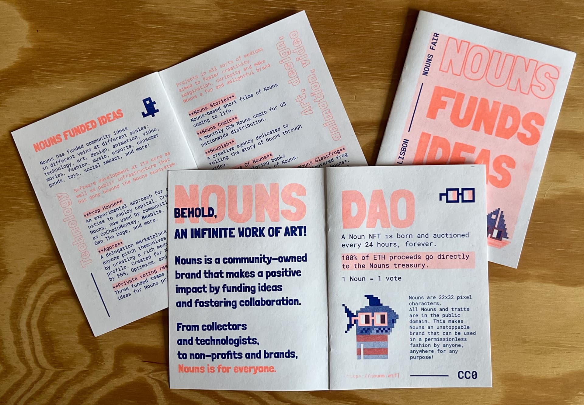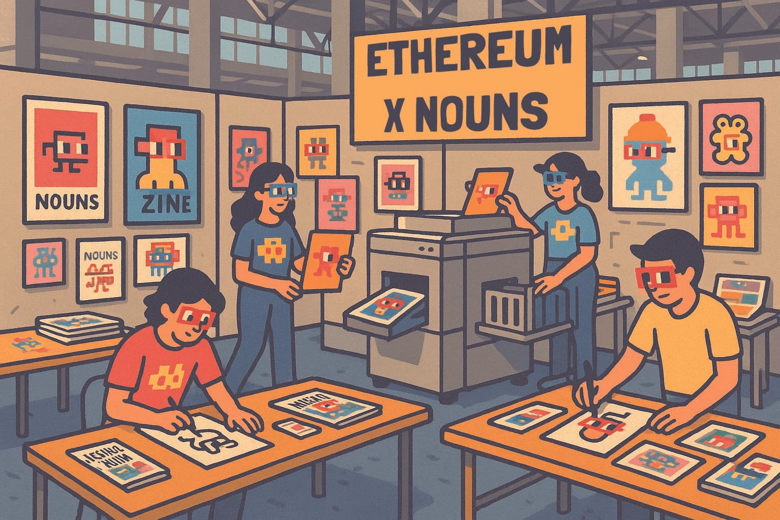 Fun fact: weβve handed out Nouns risography prints at every edition of the Nouns Fair. For us, itβs fun to spark conversations about new technologies and creative practices while grounding them in traditional media, bringing together both worlds. Using risography feels fittingβits punk, DIY spirit of self-publishing echoes the cypherpunk ethos at the heart of Ethereum.
