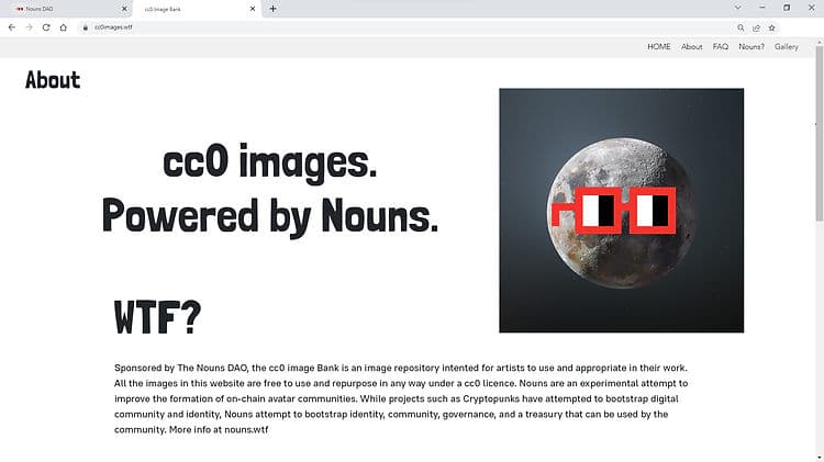 As a way to give visibility to the Nouns DAO, a cc0 image bank of space images will be set up that will serve as a repository for artists working on space-themed art. Space is a huge theme in cryptoart and NFTs. These images will be free to be used as subjects, backdrops and to be repurposed as artists see fit without the need to attribute authorship, giving artists complete control. The url cc0images.wtf has already been secured to this end.