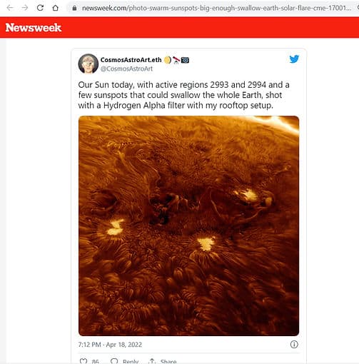 Active regions 2993 and 2994 in the solar chromosphere imaged through a Hydrogen Alpha filter.