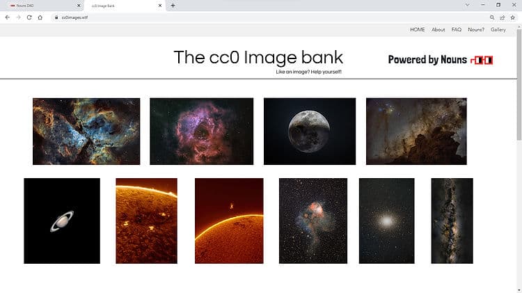 A website with the Nouns DAO branding with a set of 30 space images available for free download under a cc0 licence.